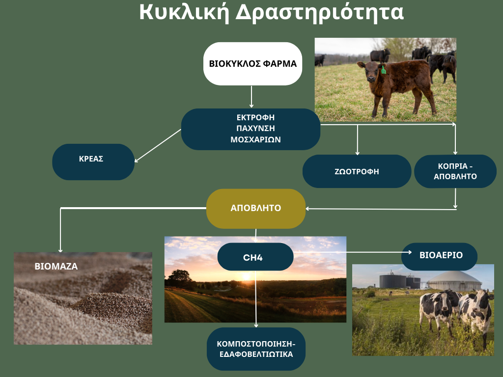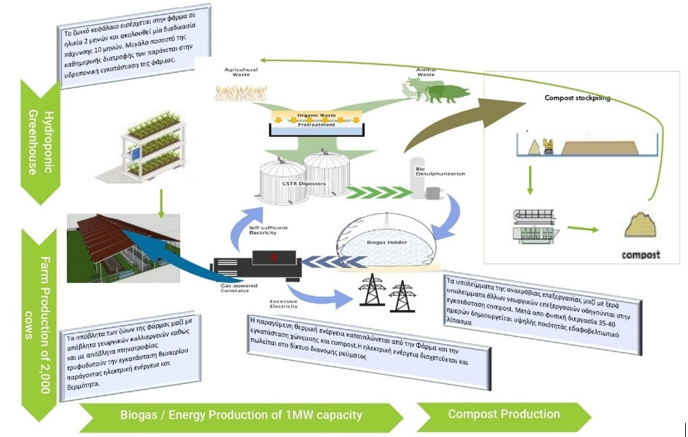 Σκοπός μας είναι μέσα από την διαδικασία εκτροφής μοσχαριών, να αξιοποιούνται τα απόβλητα και μέσω μίας φυσικής διεργασίας αναερόβιας ζύμωσης να παραχθεί βιοαέριο το οποίο xρησιμοποιείται για την παραγωγή ηλεκτρικής και θερμικής ενέργειας. Η ηλεκτρική και θερμική ενέργεια, θα αξιοποιηθεί αφενός για τη λειτουργία της μονάδας ενώ το περίσσευμα οδηγείται προς πώληση. Παράλληλα θα υλοποιείται παραγωγή χλόης φύτρου, μέσω υδροπονίας σε ελεγχόμενους θαλάμους, για τη διατροφή των ζωών. Αυτή η διεργασία απαιτεί σημαντική ποσότητα θερμικής και ηλεκτρικής ενέργειας. Τα τελικά αποδομημένα οργανικά υλικά, μέσω της φυσικής ατμοσφαιρικής ζύμωσης, μαζί με υποπροϊόντα φυτών δημιουργούν λίπασμα, το οποίο χρησιμοποιείται στους αγρούς για την παραγωγή ζωοτροφών.